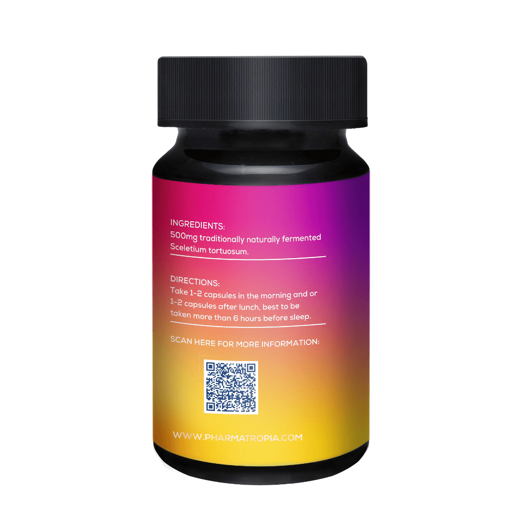 Ingredients: 500mg traditionally naturally fermented Sceletium tortuosum, Halaal certified gelatine capsules.