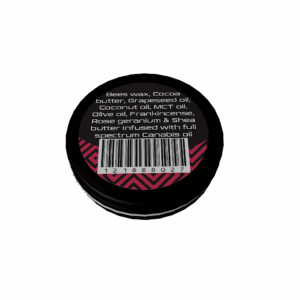 Ingredients: Beeswax, Cacao Butter, Shea Butter, Grapeseed Oil, Coconut Oil, MCT Oil, Olive Oil, Frankincense, Rose Geranium, Infused with Full Spectrum Cannabis Oil