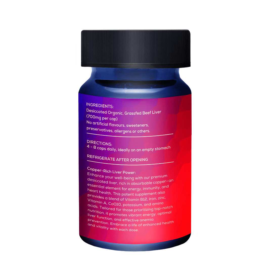 Introducing our latest premium offering, Super Nutri Boost. Each capsule contains 700mg of desiccated organic, grass-fed beef liver, providing a concentrated source of absorbable copper—an essential element crucial for energy production, immune function, and heart health.